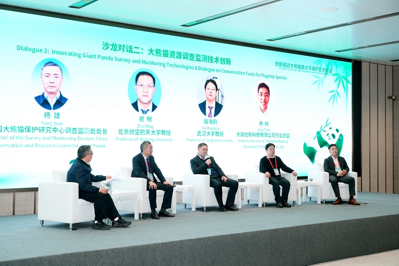 成都大熊猫繁育研究基地副主任兰景超、复旦大学研究员王放、北京师范大学教授冯利民、中国林业科学研究院研究员龚明昊聚焦大熊猫等旗舰物种保护理论与实践交流经验;中国大熊猫保护研究中心调查监测处处长杨建、北京航空航天大学教授祝明、武汉大学教授眭海刚、大疆创新科技有限公司行业总监杨腾围绕大熊猫资源调查监测技术创新分享成果。