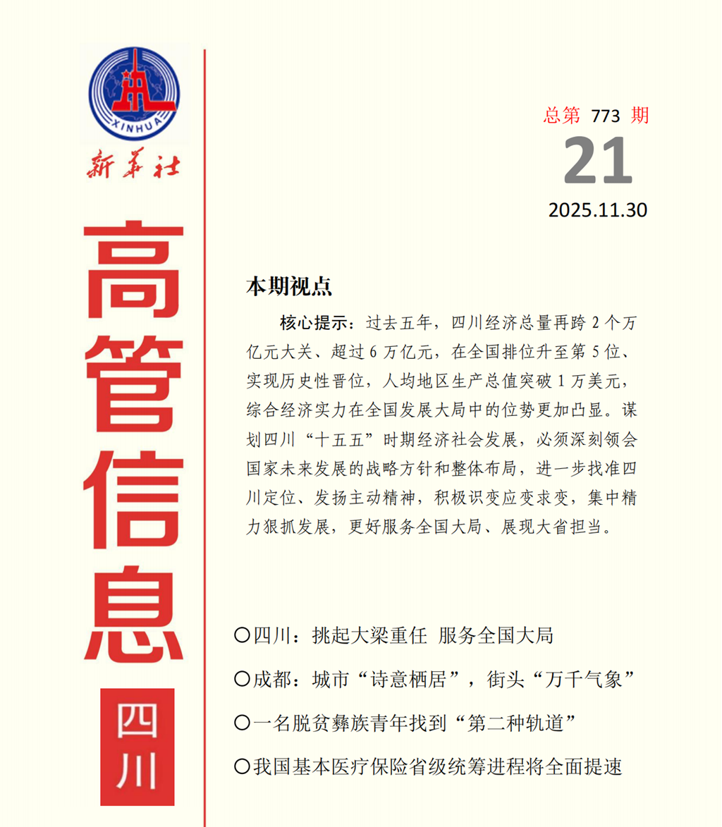 《高管信息·四川》刊物由新华社四川分社着重打造,稿件立足四川在全国发展大局中的战略定位,以做好经济宣传引导为重点,努力为奋力谱写中国式现代化四川新篇章献智献策。
