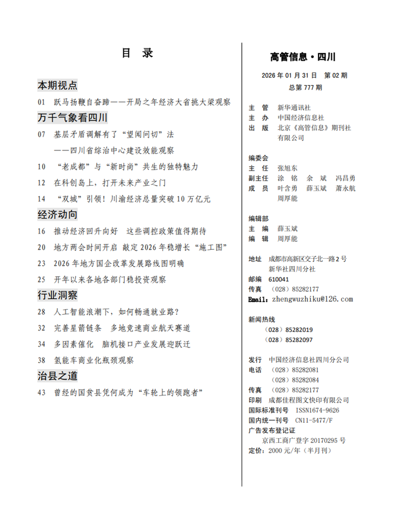 《高管信息·四川》刊物由新华社四川分社着重打造,稿件立足四川在全国发展大局中的战略定位,以做好经济宣传引导为重点,努力为奋力谱写中国式现代化四川新篇章献智献策。
