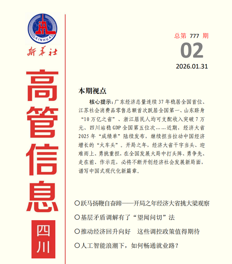 1.《本期视点》栏目刊发《跃马扬鞭自奋蹄——开局之年经济大省挑大梁观察》:广东经济总量连续37年稳居全国首位、江苏社会消费品零售总额首次跃居全国第一、山东跻身“10万亿之省”、浙江居民人均可支配收入突破7万元、四川站稳GDP全国第五位次……近期,经济大省2025年“成绩单”陆续发布,继续担当拉动中国经济增长的“火车头”。开局之年,经济大省干字当头、迎难而上、勇挑重担,在全国发展大局中打头阵、勇争先、走在前、作示范,必将不断开创经济社会发展新局面,谱写中国式现代化新篇章。