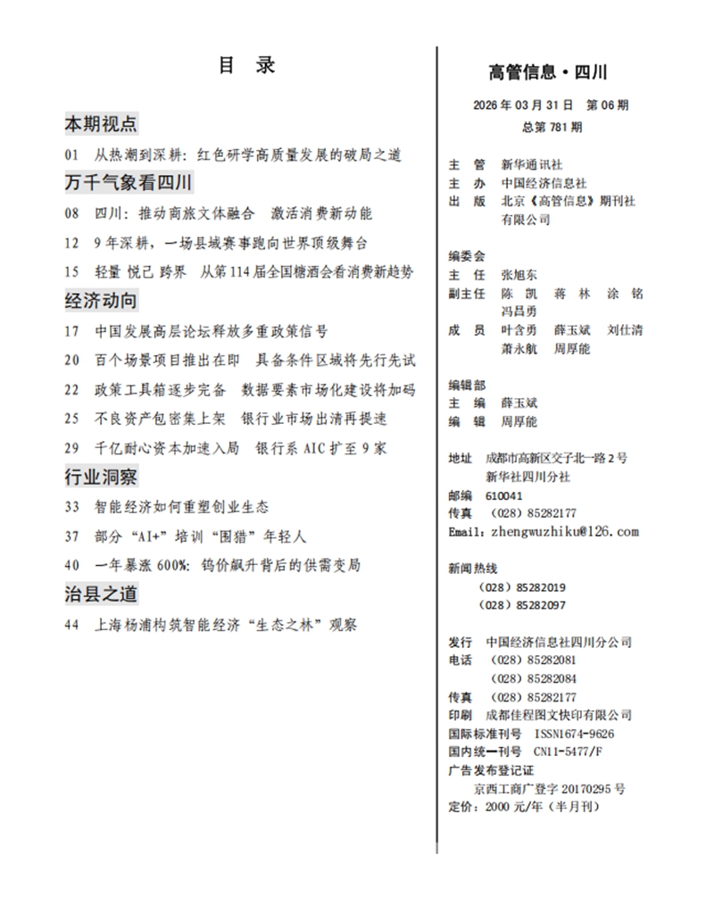 《高管信息·四川》刊物由新华社四川分社着重打造,稿件立足四川在全国发展大局中的战略定位,以做好经济宣传引导为重点,努力为奋力谱写中国式现代化四川新篇章献智献策。