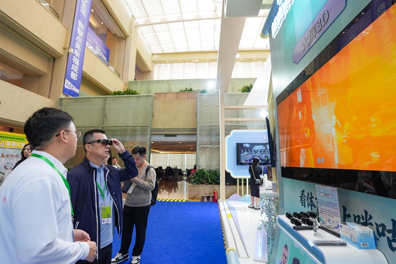 4月15日,参会者在创新展交区体验3D视听交互设备。